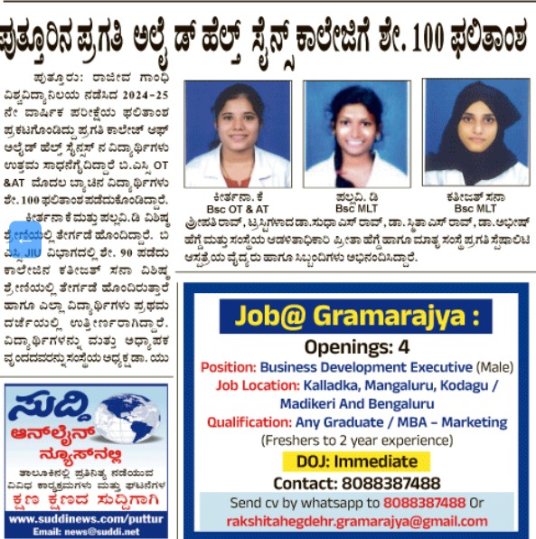 ಪುತ್ತೂರಿನ ಪ್ರಗತಿ ಅಲೈಡ್ ಹೆಲ್ತ್ ಸೈನ್ಸ್ ಕಾಲೇಜಿಗೆ ಶೇ. 100 ಫಲಿತಾಂಶ